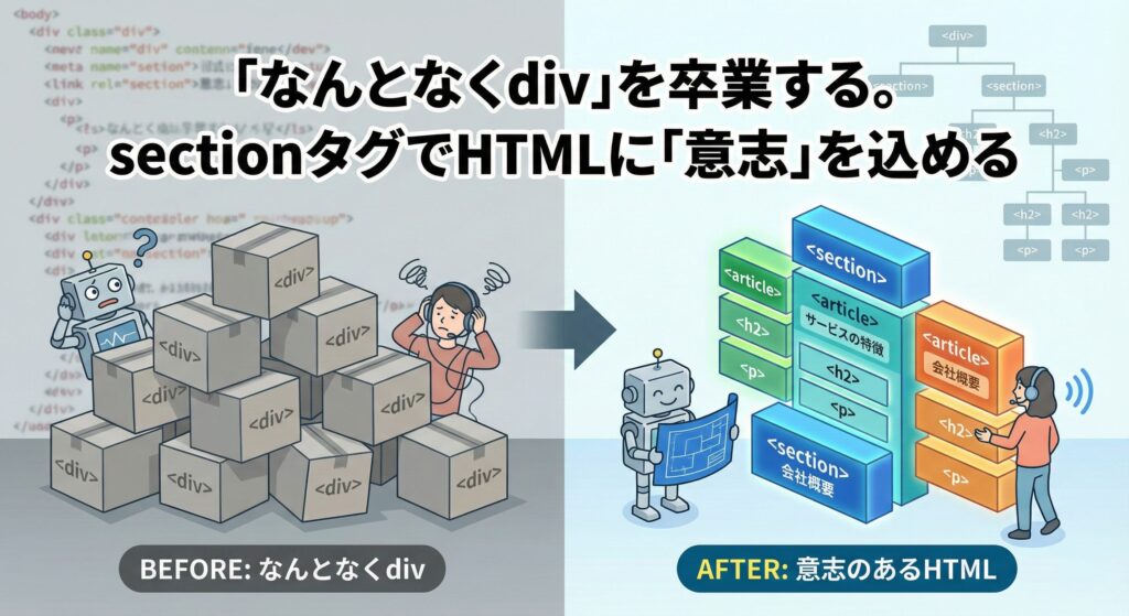 Web制作の現場で、ページの構造をすべて div で組んでしまっていませんか。たしかに div を使えば、見た目のレイアウトは問題なく再現できます。 しかし、ブラウザの向こう側にいる 検索エンジン や 支援技術(スクリーンリーダーなど) にとって、それは... -